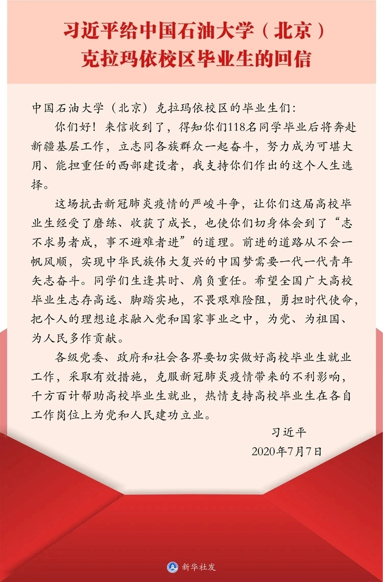2020年7月7日,习近平给中国石油大学(北京)克拉玛依校区毕业生回信,鼓励青年学子勇担时代责任使命,扎根基层建功立业。公司积极组织全体师生党员同志通过线上认真学习习总书记回信精神,并陆续收到了党员同志们的学习心得反馈。