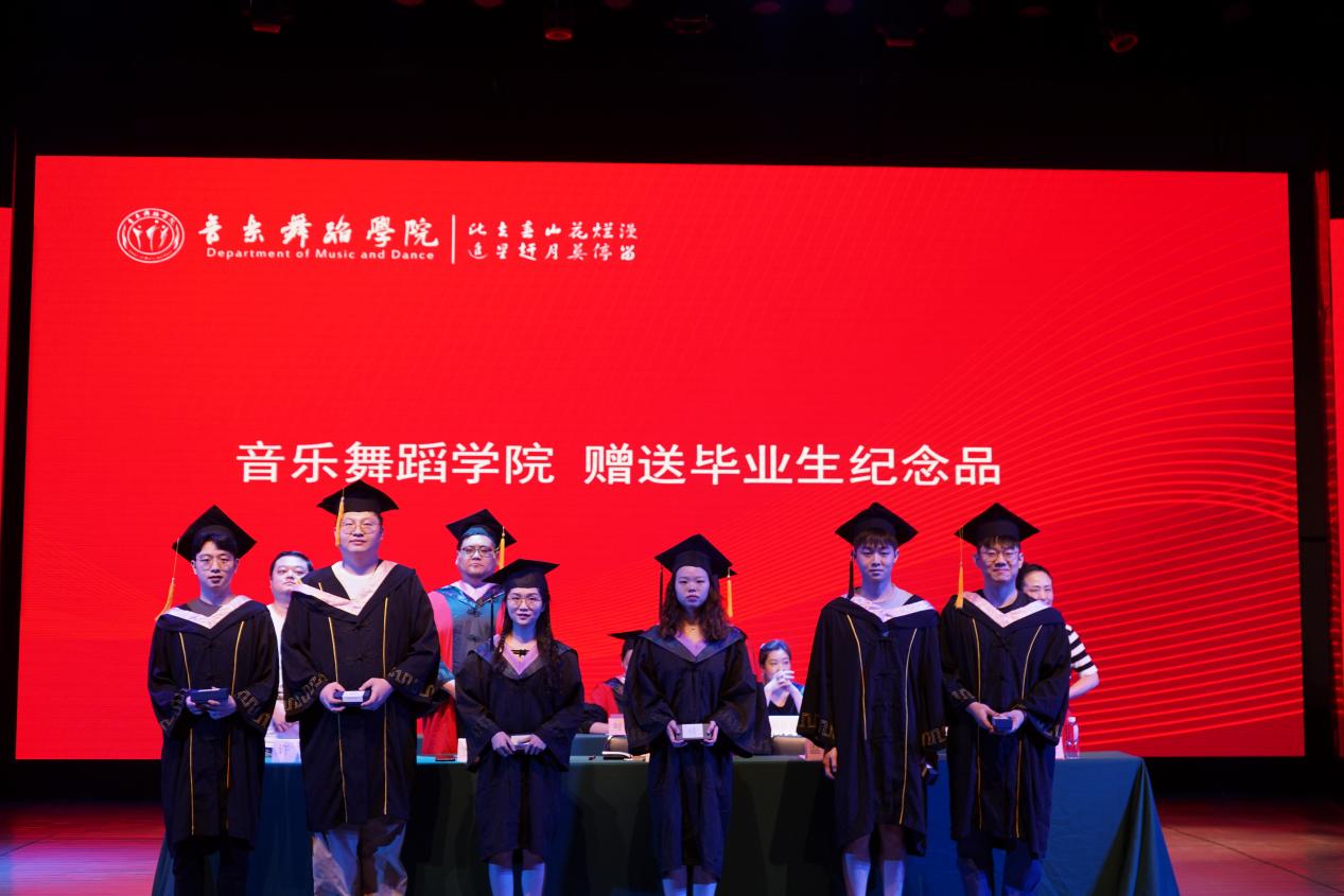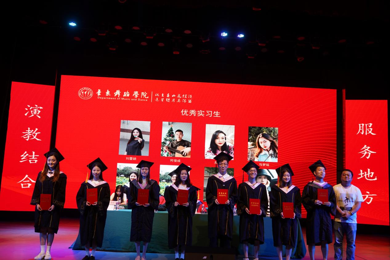 在赠礼纪念品环节,6位毕业生代表上台接受了学院赠与的毕业纪念品;颁奖环节音乐系主任许可老师为校级优秀实习生颁发荣誉证书,费毓珺副经理为校级优秀论文同学颁发荣誉证书,王婕经理为校级优秀毕业生颁发荣誉证书。