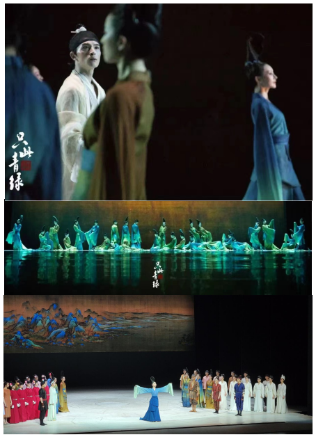 《只此青绿》用舞蹈语汇创造性转化中国十大传世名画《千里江山图》:以“青绿”为中华之美将静态的画作拟人成为一群动态的“青绿舞者”,采取时空交错式的叙事结构,借鉴非遗技艺在舞台上将一道道繁琐且细致的工序艺术化地呈现给观众。循着“展卷、问篆、唱丝、寻石、习笔、淬墨、入画”的篇章纲目,跟随一位现代故宫研究员——展卷人的视角,带领观众进入王希孟的绘画世界,徜徉在中国传统美学意趣之中,全身心地感受千里江山、天人合一的意境。